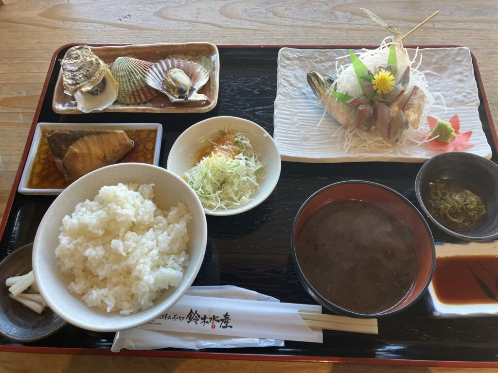 焼き牡蠣とヒオウギ貝、ブリの照り焼き、アオサの味噌汁も絶品。