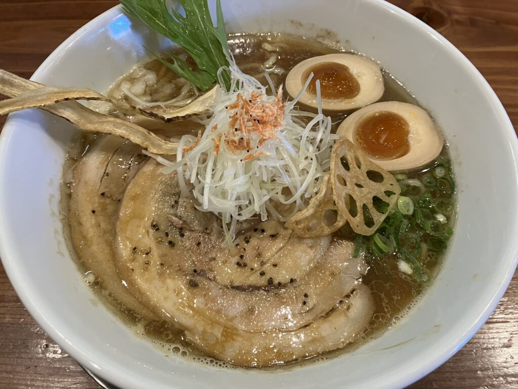 チャーシュー、煮卵、素揚げしたレンコンとごぼう、白ネギと小エビ、水菜と青ネギ。