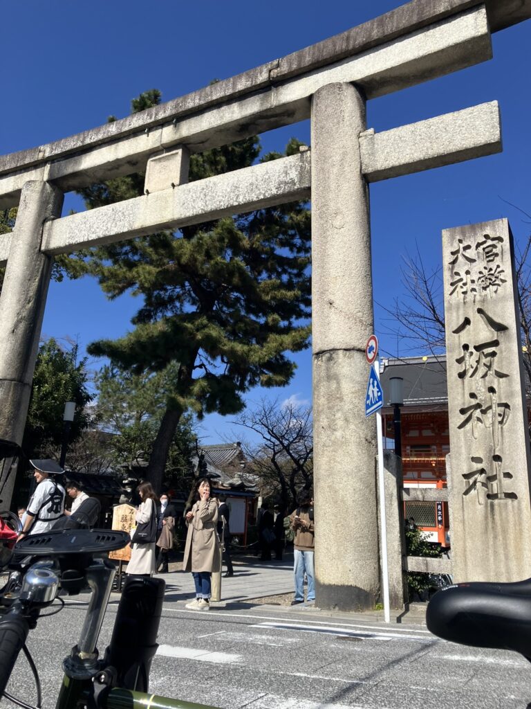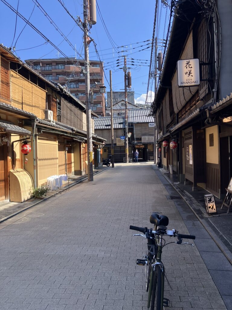 八坂神社を抜け、祇園の風情ある街並みを流す。着物姿のカップルを乗せた人力車とすれ違う。